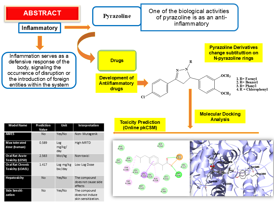 Research on heterocyclic compounds suggested that pharmacologically active agents featuring pyrazoline played a crucial role in medicinal chemistry. When fused with other heterocycles, pyrazoline, as a quiescent heterocyclic moiety, resulted in the enhancement of biological properties. Therefore, synthesizing these compounds had attracted the attention of researchers focused on designing novel drugs. The addition of substituents to the N-pyrazoline atom and modifications to the benzene ring of pyrazoline compounds were essential for the identification of pyrazoline derivatives exhibiting enhanced biological activity. Extensive research had shown that pyrazoline compounds had significant biological effects, including anti-inflammatory effects. Inflammation was the body's reaction to infection or injury and marked by symptoms such as redness, heat, swelling, and pain. This research involved a computational analysis of pyrazoline compounds utilizing molecular docking with AutoDock Tools and AutoDock Vina software on four pyrazoline derivative compounds (pyrazolines 1-4). Simultaneously, their toxicity was assessed through online pkCSM to evaluate their potential as anti-inflammatory drug candidates. The interaction between the active site of cyclooxygenase-2 (COX-2) receptor (PDB: 4PH9) and pyrazoline derivatives showed that pyrazoline 2 (1-benzoyl-(3-(4-chlorophenyl)-5-(3,4-dimethoxy)-4,5-dihydro-2-pyrazoline) exhibited the highest binding affinity of -8.0 kcal/mol compared to pyrazoline derivatives 1, 3, 4 and ibuprofen as native ligands also in the molecular docking test with values of -7.1; -7.7; -7.6; and -7.1 kcal/mol, respectively. Toxicity evaluation for pyrazoline 2 also suggested that this compound was non-toxic, non-hepatotoxic, and did not induce skin sensitization, with an Oral Rat Acute Toxicity (LOAEL) score of 1.417 log (mg/kg_bw/day).