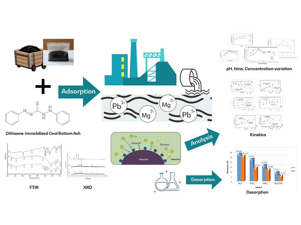 Dithizone-immobilized coal bottom ash (DICBA) was successfully prepared as Cd(II) and Mg(II) adsorbent. The parameters examined in the metal ion adsorption study included the effect of pH, adsorbent mass, contact time, and initial concentration. Sequential desorption was examined using H2O, KNO3, HNO3, and Na2EDTA. The results showed that dithizone had been successfully immobilized on the activated coal bottom ash, as verified by FTIR spectroscopy and XRD analyses. Specific wavenumbers observed included the aromatic group C=C at 1496 cm-1, the C-N group at 1319 cm-1 and the Si-O-Si at 1087 cm-1 with d-spacing values of 8.313 and 6.046 Å. The optimum conditions for adsorption were 60 min for Cd(II) and 90 min for Mg(II) at a pH of 5 with 0.2 g of adsorbent mass, and an initial concentration of Cd(II) at 50 ppm. The adsorption kinetics of Cd(II) and Mg(II) followed the Ho pseudo-second-order model with 0.174 and 0.285 (g/mol·min) rate constants for Cd(II) and Mg(II), respectively. The highest correlation coefficients (R2) were 0.995 for Cd(II) and 0.999 for Mg(II). Isotherm modeling indicated that the adsorption of Cd(II) best fitted the Langmuir model (R² = 0.988), followed by the Dubinin–Radushkevich (R² = 0.952), Freundlich (R² = 0.843), and Temkin (R² = 0.827) models. The desorption mechanism for Cd(II) and Mg(II) was formed by various interactions, such as physical mechanism (28.25% and 26.26%), ion exchange (23.13% and 14.15%), hydrogen bond formation (16.90% and 12.11%), and the mechanism of complex formation (9.56% and 6.13%).