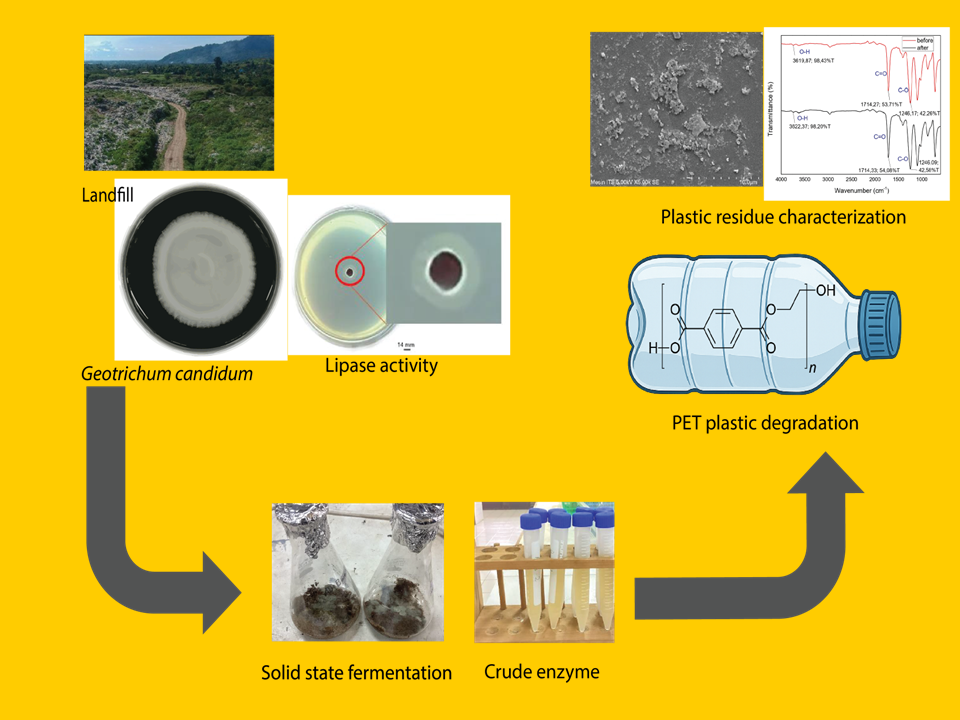 The issue of plastic waste, particularly polyethylene terephthalate (PET), has become a major global environmental concern due to its resistance to natural degradation. One promising approach to addressing PET waste is the use of lipase enzymes produced by microorganisms. This study aims to explore the potential of the fungus Geotrichum candidum J1 to produce crude lipase enzymes capable of degrading PET plastic. The research involved stages including isolation and rejuvenation of the fungus, enzyme production through solid-state fermentation, and lipase activity assay using the cup-plate method. Subsequently, PET degradation testing was carried out using the crude enzyme extract under controlled conditions for 30 days. The results indicated that the crude lipase from G. candidum J1 exhibited lipolytic activity, as evidenced by clear zones formed on selective media. The average total protein yield reached 2.992 ± 0.05 mg/mL, indicating stable fermentation. Degradation tests showed a weight loss of PET between 5.9% and 6.4%. Characterization by Fourier Transform Infra Red (FTIR) confirmed the cleavage of ester bonds in PET structure, evidenced by spectral changes in carbonyl groups. Observations using a Scanning Electron Microscope (SEM) revealed morphological changes, including cracks and pores, on the PET surface post-treatment. In conclusion, the crude lipase from G. candidum J1 demonstrates significant potential as a biodegradation agent for reducing PET plastic pollution in an environmentally friendly manner.
